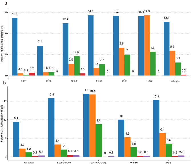 Results: Out of 2,333 patients with severe influenza, 44.1% were adults ≥ 65, and 25.6% young individuals aged 0-17. 46.8% had comorbidities (i.e., were at risk), mainly cardiovascular and metabolic diseases (45.3%), and chronic conditions (24.7%). The highest hospitalization rates were among the elderly (≥ 75) and the young individuals (0-17), and were 37.6 and 19.5/100,000 inhabitants/year, respectively. The average hospital stay was 8 days (IQR: 14 - 4). It was higher for older individuals (≥ 65 years, 11 days, [17 - 6]) and for those with comorbidities (9 days, [16 - 6]), p-value < 0.001. Similarly, mortality was higher in elderly and those at risk (p-value < 0.001). Respiratory complications occurred in 12.7% of patients, and cardiovascular disorders in 5.9%. Total influenza-related costs were €9.7 million with hospitalization accounting for 95% of them. 47.3% of hospitalization costs were associated with individuals ≥ 65 and 52.9% with patients at risk. The average hospitalisation cost per patient was € 4,007.
