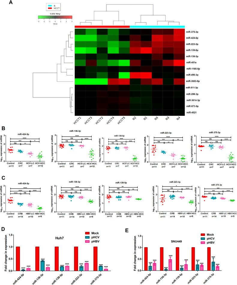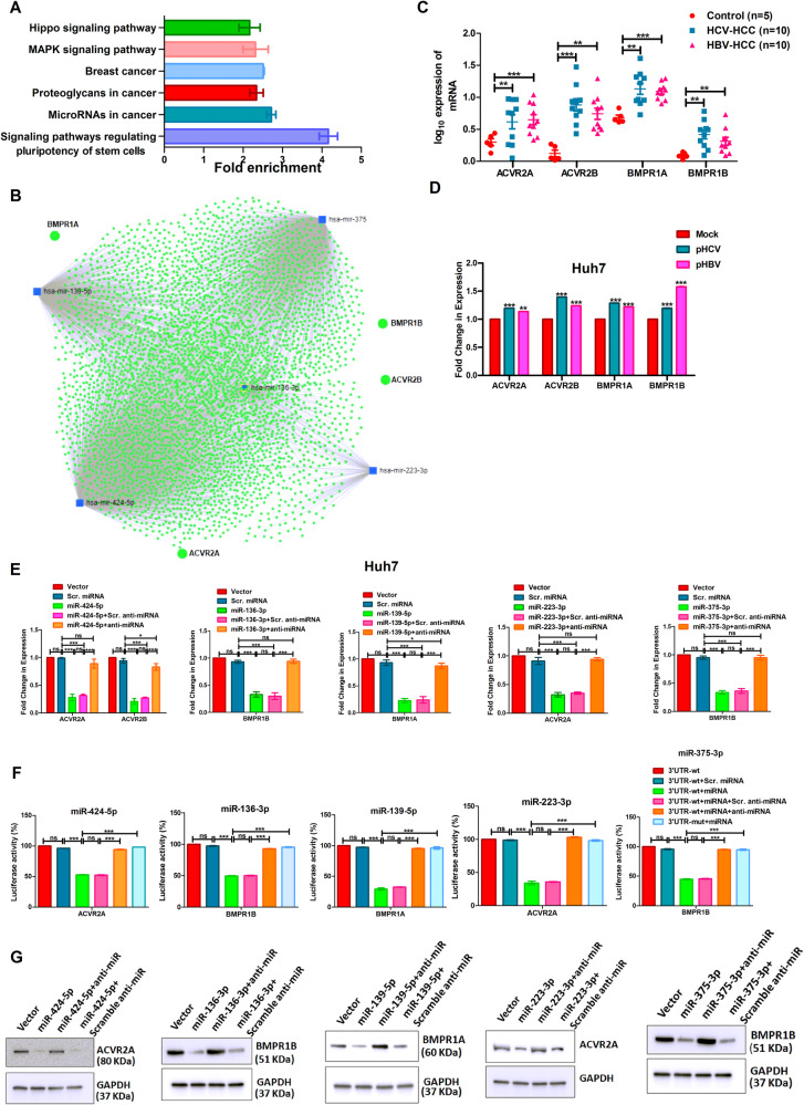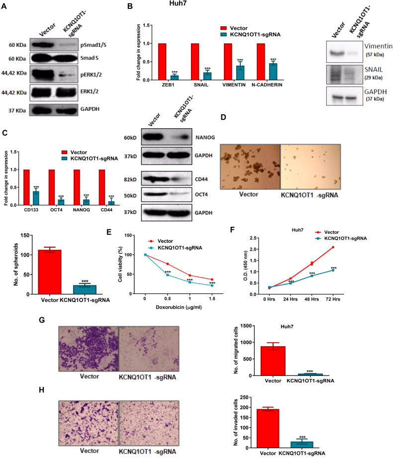 Diverse mechanisms have been established to understand the chemoresistance of hepatocellular carcinoma (HCC), but the contribution of non-coding RNAs is not surveyed well. Here, we aimed to explore the lncRNA-miRNA axis in Hepatitis C and B virus (HCV and HBV) infected HCC to investigate the molecular mechanism of chemoresistance and to identify a potential therapeutic target for HCC. The small RNA transcriptome analysis followed by qRT-PCR validation with the liver tissues of both HCV and HBV infected HCC patients revealed that miR-424-5p, miR-136-3p, miR-139-5p, miR-223-3p, and miR-375-3p were the most downregulated miRNAs in HCC compared to normal (log2 fold change ≤-1.5, Padj ≤ 0.05). In silico pathway analysis with the validated targets of each miRNA revealed that the signalling pathway regulating pluripotency of stem cells is commonly targeted by these five miRNAs. Subsequent validation by 3'UTR-luciferase assay and western blot analysis unveiled that these five miRNAs impeded either same or diverse genes, but all linked to BMP signalling pathway such as BMPR1A/BMPR1B by miR-139-5p, miR-136-3p, and miR-375-3p, and ACVR2A/ACVR2B by miR-424-5p and miR-223-3p. Furthermore, restoration of each miRNA in Huh7/SNU449 cells inhibited phosphorylation of downstream SMAD1/5 and ERK1/2, and attenuated Epithelial-mesenchymal transition, stemness, spheroid formation, chemoresistance, invasion and migration of cells. To investigate the mechanism of suppression of these miRNAs, "DIANA" tool was employed and lncRNA-KCNQ1OT1 was retrieved as interacting partner of all the five miRNAs. In vitro RNA pull-down assay revealed that lncRNA-KCNQ1OT1 physically interacted and sequestered these five miRNAs in the cytoplasm. Hence, KCNQ1OT1 was suppressed in Huh7/SNU449 cells using CRISPR technology and observed regression of oncogenic properties with enhanced chemosensitivity and reduced metastasis in cancer cells. Shrinkage of tumour size and volume in NOD-SCID mice injected with KCNQ1OT1-sgRNA cells further strengthened our observations. Thus, lncRNA-KCNQ1OT1 is the main regulator, which reduces the level of beneficiary miRNAs in the tumour milieu and modulates BMP signalling pathway to promote chemoresistance in HCC, suggesting lncRNA-KCNQ1OT1 might have robust potential to be a therapeutic target in HCC.