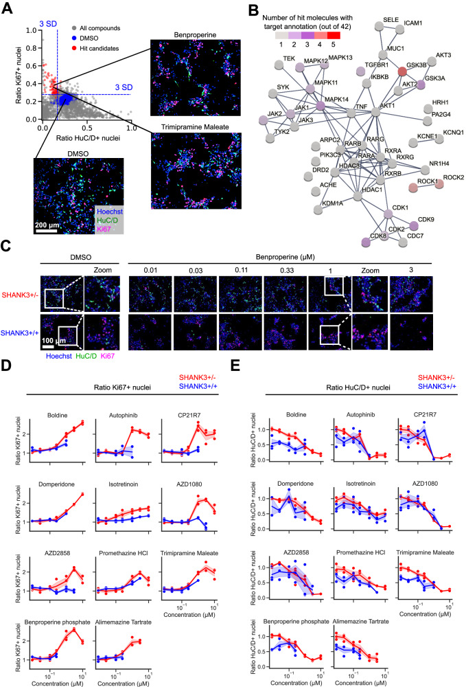 Phelan-McDermid syndrome (PMDS) arises from mutations in the terminal region of chromosome 22q13, impacting the SHANK3 gene. The resulting deficiency of the postsynaptic density scaffolding protein SHANK3 is associated with autism spectrum disorder (ASD). We examined 12 different PMDS patient and CRISPR-engineered stem cell-derived neuronal models and controls and found that reduced expression of SHANK3 leads to neuronal hyperdifferentiation, increased synapse formation, and decreased neuronal activity. We performed automated imaging-based screening of 7,120 target-annotated small molecules and identified three compounds that rescued SHANK3-dependent neuronal hyperdifferentiation. One compound, Benproperine, rescued the decreased colocalization of Actin Related Protein 2/3 Complex Subunit 2 (ARPC2) with ß-actin and rescued increased synapse formation in SHANK3 deficient neurons when administered early during differentiation. Neuronal activity was only mildly affected, highlighting Benproperine's effects as a neurodevelopmental modulator. This study demonstrates that small molecular compounds that reverse developmental phenotypes can be identified in human neuronal PMDS models.