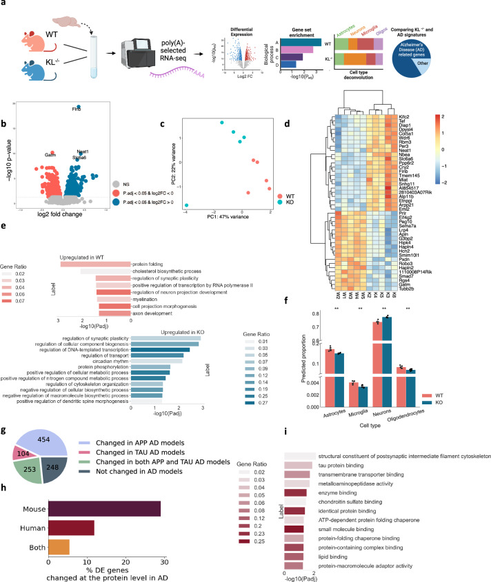 Overexpression of the longevity gene Klotho prolongs lifespan, while its knockout shortens lifespan and impairs cognition via perturbation of myelination and synapse formation. However, comprehensive analysis of Klotho knockout effects on mammalian brain transcriptomics is lacking. Here, we report that Klotho knockout alters the levels of aging- and cognition related mRNAs, long non-coding RNAs, microRNAs and tRNA fragments. These include altered neuronal and glial regulators in murine models of aging and Alzheimer's disease and in human Alzheimer's disease post-mortem brains. We further demonstrate interaction of the knockout-elevated tRNA fragments with the spliceosome, possibly affecting RNA processing. Last, we present cell type-specific short RNA-seq datasets from FACS-sorted neurons and microglia of live human brain tissue demonstrating in-depth cell-type association of Klotho knockout-perturbed microRNAs. Together, our findings reveal multiple RNA transcripts in both neurons and glia from murine and human brain that are perturbed in Klotho deficiency and are aging- and neurodegeneration-related.
