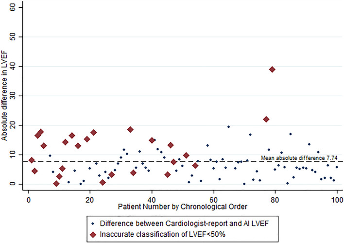The increasing prevalence of heart failure (HF) in ageing populations drives demand for echocardiography (echo). There is a worldwide shortage of trained sonographers and long waiting times for expert echo. We hypothesised that artificial intelligence (AI)-enhanced point-of-care echo can enable HF screening by novices. The primary endpoint was the accuracy of AI-enhanced novice pathway in detecting reduced LV ejection fraction (LVEF) < 50%. Symptomatic patients with suspected HF (N = 100, mean age 61 ± 15 years, 56% men) were prospectively recruited. Novices with no prior echo experience underwent 2-weeks' training to acquire echo images with AI guidance using the EchoNous Kosmos handheld echo, with AI-automated reporting by Us2.ai (AI-enhanced novice pathway). All patients also had standard echo by trained sonographers interpreted by cardiologists (reference standard). LVEF < 50% by reference standard was present in 27 patients. AI-enhanced novice pathway yielded interpretable results in 96 patients and took a mean of 12 min 51 s per study. The area under the curve (AUC) of the AI novice pathway was 0.880 (95% CI 0.802, 0.958). The sensitivity, specificity, positive predictive and negative predictive values of the AI-enhanced novice pathway in detecting LVEF < 50% were 84.6%, 91.4%, 78.5% and 94.1% respectively. The median absolute deviation of the AI-novice pathway LVEF from the reference standard LVEF was 6.03%. AI-enhanced novice pathway holds potential to task shift echo beyond tertiary centres and improve the HF diagnostic workflow.