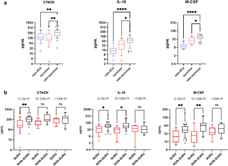 The aim of this study was to characterize the systemic cytokine signature of critically ill COVID-19 patients in a high mortality setting aiming to identify biomarkers of severity, and to explore their associations with viral loads and clinical characteristics. We studied two COVID-19 critically ill patient cohorts from a referral centre located in Central Europe. The cohorts were recruited during the pre-alpha/alpha (November 2020 to April 2021) and delta (end of 2021) period respectively. We determined both the serum and bronchoalveolar SARS-CoV-2 viral load and identified the variant of concern (VoC) involved. Using a cytokine multiplex assay, we quantified systemic cytokine concentrations and analyzed their relationship with clinical findings, routine laboratory workup and pulmonary function data obtained during the ICU stay. Patients who did not survive had a significantly higher systemic and pulmonary viral load. Patients infected with the pre-alpha VoC showed a significantly lower viral load in comparison to those infected with the alpha- and delta-variants. Levels of systemic CTACK, M-CSF and IL-18 were significantly higher in non-survivors in comparison to survivors. CTACK correlated directly with APACHE II scores. We observed differences in lung compliance and the association between cytokine levels and pulmonary function, dependent on the VoC identified. An intra-cytokine analysis revealed a loss of correlation in the non-survival group in comparison to survivors in both cohorts. Critically ill COVID-19 patients exhibited a distinct systemic cytokine profile based on their survival outcomes. CTACK, M-CSF and IL-18 were identified as mortality-associated analytes independently of the VoC involved. The Intra-cytokine correlation analysis suggested the potential role of a dysregulated systemic network of inflammatory mediators in severe COVID-19 mortality.