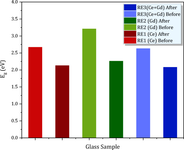 From the useless municipal solid waste (MSW) ashes, CeO2, Gd2O3 and CeO2 + Gd2O3 doped borosilicate glasses were organized via melting-quenching procedure. Various optical, structural, physical and radiation shielding parameters were examined towards the influence of 100 kGy of γ-radiation. UV-visible NIR spectra revealed UV peaks at 351, 348 and 370 nm corresponding to the trivalent states of Ce3+ and Gd3+ ions, while, photoluminescence (PL) spectra displayed asymmetric broad excitations of Ce3+ and Gd3+ ions due to 4f → 5d transitions, and emission intense bands at 412, 434, and 417 nm. CIE chromaticity shows that Gd3+ ions increase the luminescence of Ce3+. FTIR absorption bands revealed an overlapping between tetrahedral groups of silicate (SiO4), with trigonal (BO3) and tetrahedral (BO4) units of borate. The influence of 100 kGy obtains quite reduction in UV-visible NIR and PL peaks, large stability in FTIR and ESR spectra, and stability of thermal expansion coefficient (CTE) as well. The whole data revealed optical, structural and physical stability of glasses after irradiation besides an enhancement in microhardness owing to more structural compactness and high bonding connectivity. Radiation shielding parameters from Phy-X/PSD program showed higher values of mass (MAC) and linear attenuation coefficients (LAC), and effective atomic number (Zeff) in the order of; glass Ce+Gd > glass Ce > glass Gd. Ce + Gd doped glass revealed also the lowest half value layer (HVL) comparing to other shielding commercial concretes. The study recommends the beneficial and economical use of the useless MSW ash to produce CeO2 and/or Gd2O3 borosilicate glasses with hopeful radiation shielding features.