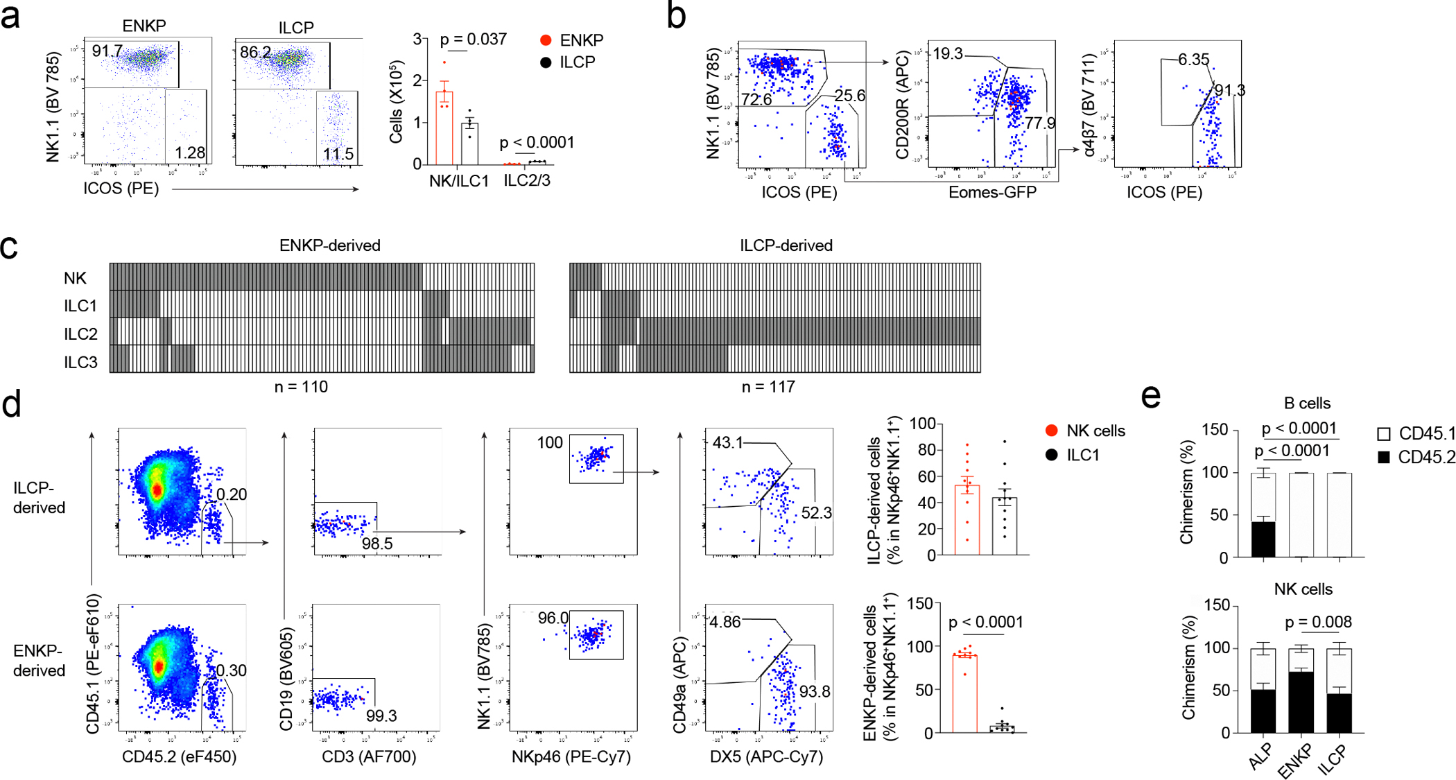 Natural killer (NK) cells function by eliminating virus-infected or tumor cells. Here we identified an NK-lineage-biased progenitor population, referred to as early NK progenitors (ENKPs), which developed into NK cells independently of common precursors for innate lymphoid cells (ILCPs). ENKP-derived NK cells (ENKP_NK cells) and ILCP-derived NK cells (ILCP_NK cells) were transcriptionally different. We devised combinations of surface markers that identified highly enriched ENKP_NK and ILCP_NK cell populations in wild-type mice. Furthermore, Ly49H+ NK cells that responded to mouse cytomegalovirus infection primarily developed from ENKPs, whereas ILCP_NK cells were better IFNγ producers after infection with Salmonella and herpes simplex virus. Human CD56dim and CD56bright NK cells were transcriptionally similar to ENKP_NK cells and ILCP_NK cells, respectively. Our findings establish the existence of two pathways of NK cell development that generate functionally distinct NK cell subsets in mice and further suggest these pathways may be conserved in humans.