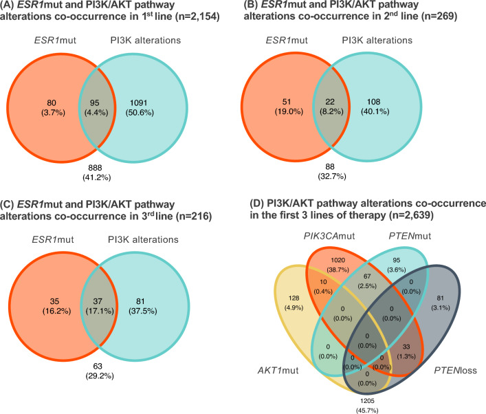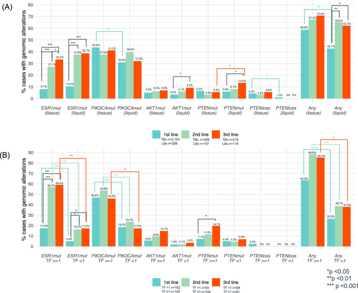 Results: ~ 60% of cases harbored 1 + GA in 1st-line TBx (1266/2154) or LBx TF ≥ 1% (80/126) and 26.5% (43/162) in LBx TF < 1%. ESR1mut was found in 8.1% TBx, 17.5% LBx TF ≥ 1%, and 4.9% LBx TF < 1% in 1st line, increasing to 59% in 3rd line (LBx TF ≥ 1%). PTENloss was detected at higher rates in TBx (4.3%) than LBx (1% in TF ≥ 1%). Patients receiving 1st-line aromatase inhibitor + CDK4/6 inhibitor (n = 573) with ESR1mut had less favorable rwPFS and rwOS versus ESR1 wild-type; no differences were observed for fulvestrant + CDK4/6 inhibitor (n = 348).