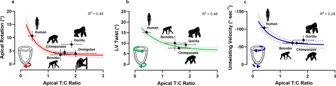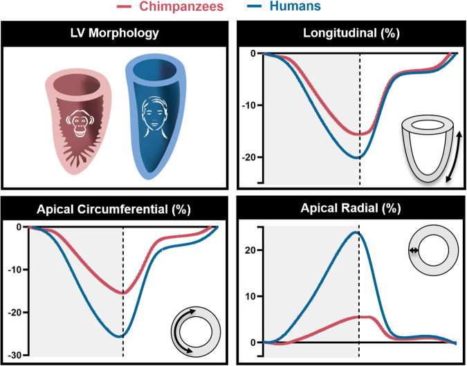 Although the gross morphology of the heart is conserved across mammals, subtle interspecific variations exist in the cardiac phenotype, which may reflect evolutionary divergence among closely-related species. Here, we compare the left ventricle (LV) across all extant members of the Hominidae taxon, using 2D echocardiography, to gain insight into the evolution of the human heart. We present compelling evidence that the human LV has diverged away from a more trabeculated phenotype present in all other great apes, towards a ventricular wall with proportionally greater compact myocardium, which was corroborated by post-mortem chimpanzee (Pan troglodytes) hearts. Speckle-tracking echocardiographic analyses identified a negative curvilinear relationship between the degree of trabeculation and LV systolic twist, revealing lower rotational mechanics in the trabeculated non-human great ape LV. This divergent evolution of the human heart may have facilitated the augmentation of cardiac output to support the metabolic and thermoregulatory demands of the human ecological niche.
