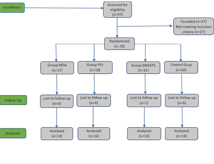 Materials and methods: A total of fifty-six systemically healthy patients with a mandibular single-rooted tooth with periapical lesions of endodontic origin and a periapical index score of 3 or higher were included in the study. Before the treatment procedures, lesion volumes were determined volumetrically using cone-beam computed tomography (CBCT). Patients were randomized into treatment (MDA, PUI, SWEEPS) and control groups (n = 14). Root canal treatment and irrigation procedures were performed by a calibrated postgraduate operator and completed at one visit. For routine follow-up, clinical and radiographic evaluations were performed by a blinded evaluator using periapical (PA) radiographs according to Molven's criteria at 3, 6, and 9 months. At 12 months, lesion volumes were quantified volumetrically using CBCT (ITK-SNAP). The data were statistically analyzed with the Wilcoxon test. The significance level was set at p < 0.05.