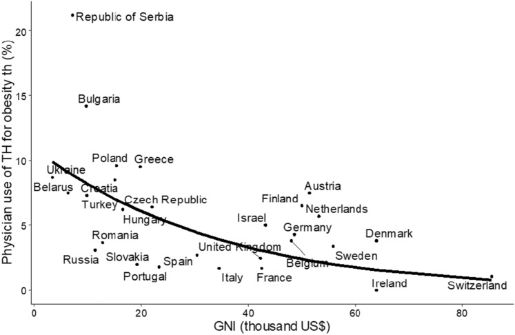 Conclusions: Despite the lack of evidence, and contrary to guidelines' recommendations, about 5% of respondents stated that TH may be indicated as a treatment for obesity in euthyroid patients resistant to life-style interventions. This opinion was associated with (i) respondent characteristics: being non-endocrinologist, working in private practice, treating a small number of hypothyroid patients annually and (ii) national characteristics: prevalence of obesity, Eastern Europe, low GNI and lack of national hypothyroidism guidelines.