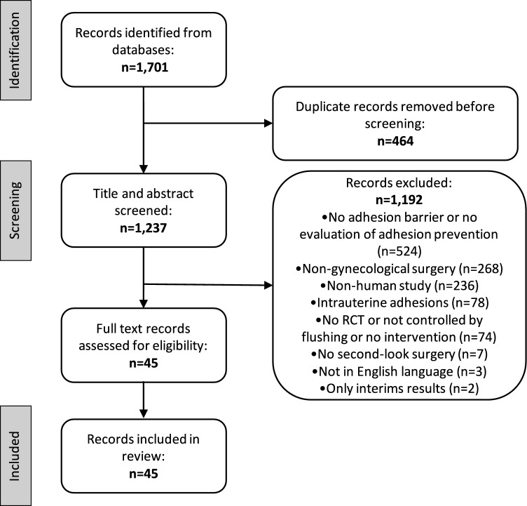 Results: We included 45 RCTs with a total of 4,120 patients examining a total of 10 unique types of barriers in second-look gynecological surgery. While RCTs on oxidized regenerated cellulose (significant improvement in 6 of 14 trials), polyethylene glycol with/without other agents (4/10), hyaluronic acid and hyaluronate + carboxymethylcellulose (7/10), icodextrin (1/3), dextran (0/3), fibrin-containing agents (1/2), expanded polytetrafluoroethylene (1/1), N,O-carboxymethylchitosan (0/1), and modified starch (1/1) overall showed inconsistent findings, results for expanded polytetrafluoroethylene, hyaluronic acid, and modified starch yielded the greatest improvements regarding adhesion reduction at 75%, 0-67%, and 85%, respectively.