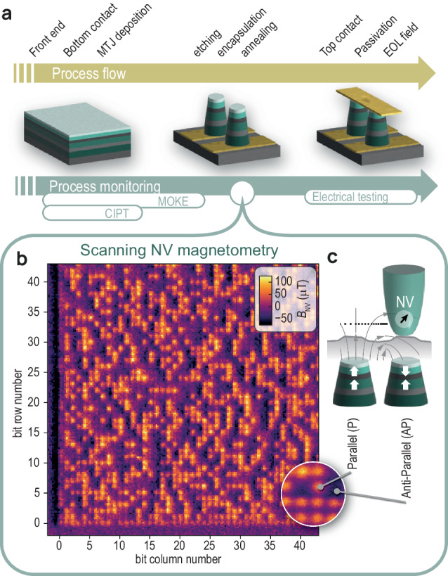 Magnetic random access memory (MRAM) is a leading emergent memory technology that is poised to replace current non-volatile memory technologies such as eFlash. However, controlling and improving distributions of device properties becomes a key enabler of new applications at this stage of technology development. Here, we introduce a non-contact metrology technique deploying scanning NV magnetometry (SNVM) to investigate MRAM performance at the individual bit level. We demonstrate magnetic reversal characterization in individual, <60 nm-sized bits, to extract key magnetic properties, thermal stability, and switching statistics, and thereby gauge bit-to-bit uniformity. We showcase the performance of our method by benchmarking two distinct bit etching processes immediately after pattern formation. In contrast to ensemble averaging methods such as perpendicular magneto-optical Kerr effect, we show that it is possible to identify out of distribution (tail-bits) bits that seem associated to the edges of the array, enabling failure analysis of tail bits. Our findings highlight the potential of nanoscale quantum sensing of MRAM devices for early-stage screening in the processing line, paving the way for future incorporation of this nanoscale characterization tool in the semiconductor industry.
