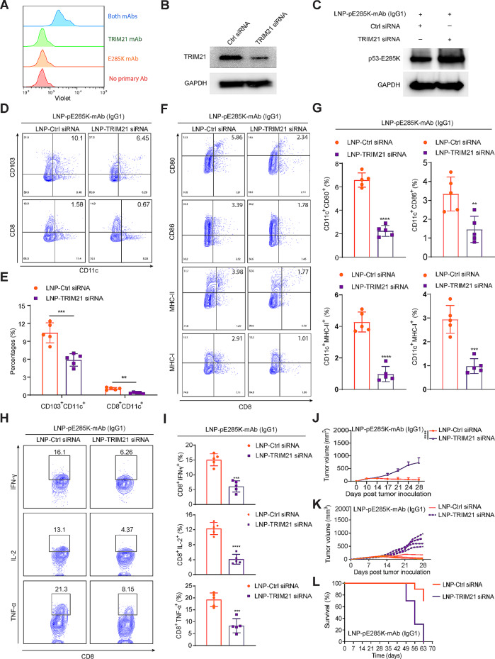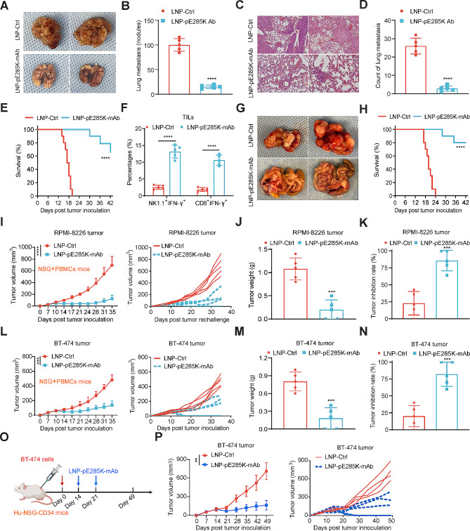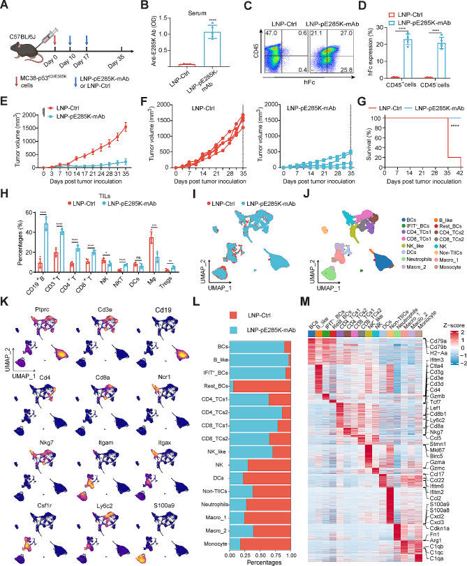 Methods: We developed monoclonal antibodies (mAbs) that target a p53 hotspot mutation E285K without cross-reactivity with wild-type p53. They were delivered using lipid nanoparticles (LNPs) that encapsulate DNA plasmids. Western blot, BLI, flow cytometry, single-cell sequencing (scRNA-seq), and other methods were employed to assess the function of mAbs in vitro and in vivo.