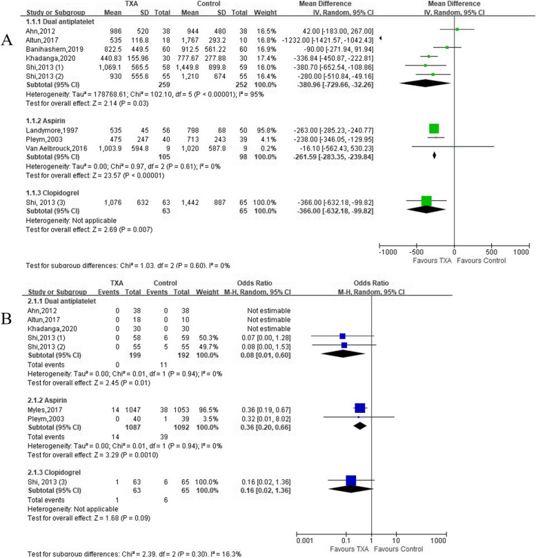 Results: A total of 12 RCTs with 3018 adult cardiac surgical patients (TXA group, 1510 patients; Control group, 1508 patients) were included. The current study demonstrated that TXA significantly reduced post-operative blood loss (MD = - 0.38 L, 95% CI: - 0.73 to - 0.03, P = 0.03; MD = - 0.26 L, 95% CI: - 0.28 to - 0.24, P < 0.00001; MD = - 0.37 L, 95% CI: - 0.63 to - 0.10, P = 0.007) in patients receiving dual antiplatelet therapy (DAPT), aspirin, or clopidogrel, respectively. Patients in TXA group had significantly lower incidence of reoperation for bleeding as compared to those in Control group. The post-operative transfusion of RBC and FFP requirements was significantly lower in TXA group than Control group. Subgroup analyses showed that studies with DAPT discontinued on the day of surgery significantly increased the risk of post-operative blood loss [(MD: - 1.23 L; 95% CI: - 1.42 to - 1.04) vs. (MD: - 0.16 L; 95% CI: - 0.27 to - 0.05); P < 0.00001 for subgroup difference] and RBC transfusion [(MD: - 3.90 units; 95% CI: - 4.75 to - 3.05) vs. (MD: - 1.03 units; 95% CI: - 1.96 to - 0.10); P < 0.00001 for subgroup difference] than those with DAPT discontinued less than 5-7 days preoperatively.