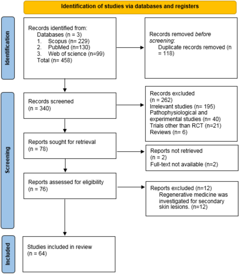 Aims and objectives: The aim of this study is to systematically review randomized controlled clinical trials (RCTs) studying various types of regenerative medicine methods (such as platelet-rich plasma, stromal vascular fraction, cell therapy, conditioned media, etc.) in treating specific dermatologic diseases. Rejuvenation, scarring, wound healing, and other secondary conditions of skin damage were not investigated in this study.