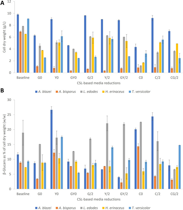 Submerged cultivation of edible filamentous fungi (Agaricomycetes) in bioreactors enables maximum mass transfer of nutrients and has the potential to increase the volumetric productivity of fungal biomass compared to solid state cultivation. These aspects are paramount if one wants to increase the range of bioactives (e.g. glucans) in convenient time frames. In this study, Trametes versicolor (M9911) outperformed four other Agaricomycetes tested strains (during batch cultivations in an airlift bioreactor). This strain was therefore further tested in semi-continuous cultivation. Continuous and semi-continuous cultivations (driven by the dilution rate, D) are the preferred bioprocess strategies for biomass production. We examined the semi-continuous cultivation of T. versicolor at dilution rates between 0.02 and 0.1 h-1. A maximum volumetric productivity of 0.87 g/L/h was obtained with a D of 0.1 h-1 but with a lower total biomass production (cell dry weight, CDW 8.7 g/L) than the one obtained at lower dilution rates (12.3 g/L at D of 0.04 and vs 13.4 g/L, at a D of 0.02 h-1). However, growth at a D of 0.1 h-1 resulted in a very short fermentation (18 h) which terminated due to washout (the specific D exceeded the maximum growth rate of the fungal biomass). At a D of 0.04 h-1, a CDW of 12.3 g/L was achieved without compromising the total residence time (184 h) of the fermentation. While the D of 0.04 h-1 and 0.07 h-1 achieved comparable volumetric productivities (0.5 g/L/h), the total duration of the fermentation at D of 0.07 h-1 was only 85 h. The highest glucan content of cells (27.8 as percentage of CDW) was obtained at a D of 0.07 h-1, while the lowest glucan content was observed in T. versicolor cells grown at a D of 0.02 h-1. KEY POINTS: • The highest reported volumetric productivity for fungal biomass was 0.87 g/L/h. • Semi-continuous fermentation at D of 0.02 h-1 resulted in 13.4 g/L of fungal biomass. • Semi-continuous fermentation at D of 0.07 h-1 resulted in fungal biomass with 28% of total glucans.