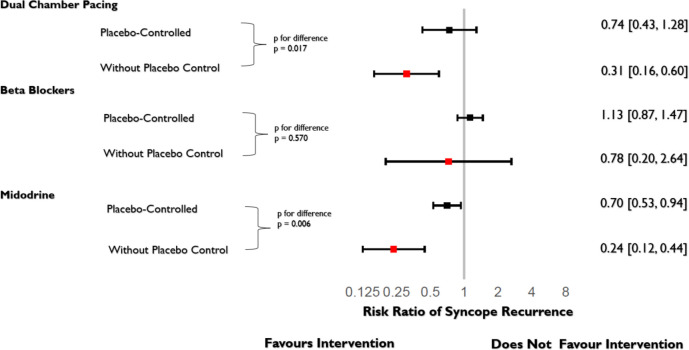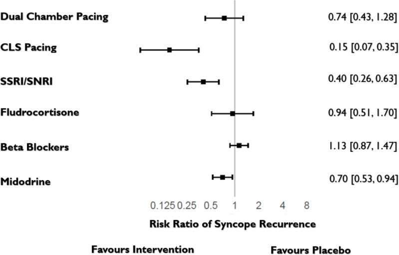 Results: We identified 47 eligible trials randomising 3518 patients. Blinded trials assessing syncope recurrence were neutral for beta blockers, fludrocortisone and conventional dual-chamber pacing but were favourable for selective serotonin reuptake inhibitors (SSRIs) (RR 0.40, 95% CI 0.26 to 0.63, p<0.001), midodrine (RR 0.70, 95% CI 0.53 to 0.94, p=0.016) and closed-loop stimulation (CLS) pacing (RR 0.15, 95% CI 0.07 to 0.35, p<0.001). Unblinded trials reported significant benefits for all therapy categories other than beta blockers and consistently showed larger benefits than blinded trials.