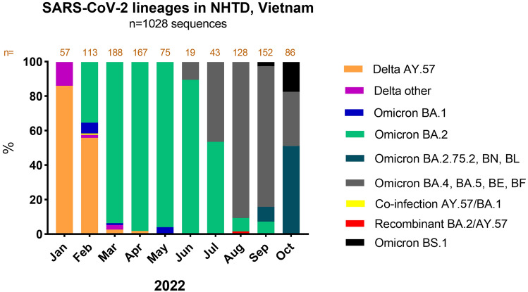 The first nationwide outbreak of COVID-19 in Vietnam started in late April 2021 and was caused almost exclusively by a single Delta lineage, AY.57. In early 2022, multiple Omicron variants co-circulated with Delta variants and quickly became dominant. The co-circulation of Delta and Omicron happened leading to possibility of co-infection and recombination events which can be revealed by viral genomic data. From January to October 2022, a total of 1028 viral RNA samples out of 4852 positive samples (Ct < 30) were sequenced by the long pooled amplicons method on Illumina platforms. All sequencing data was analysed by the workflow for SARS-CoV-2 on CLC genomics workbench and Illumina Dragen Covid application. Among those sequenced samples, we detected a case of Delta AY.57/Omicron BA.1 co-infection and two cases of infection with Delta AY.57/Omicron BA.2 recombinants which were nearly identical and had different epidemiological characteristics. Since the AY.57 lineage circulated almost exclusively in Vietnam, these results strongly suggest domestic events of co-infection and recombination. These findings highlight the strengths of genomic surveillance in monitoring the circulating variants in the community enabling rapid identification of viral changes that may affect viral properties and evolutionary events.