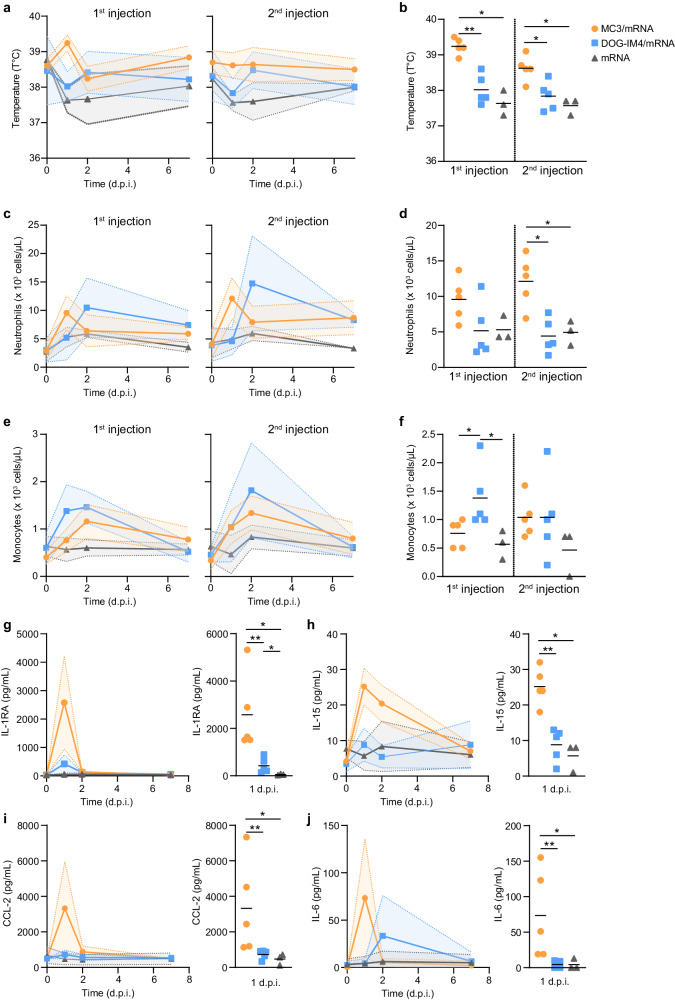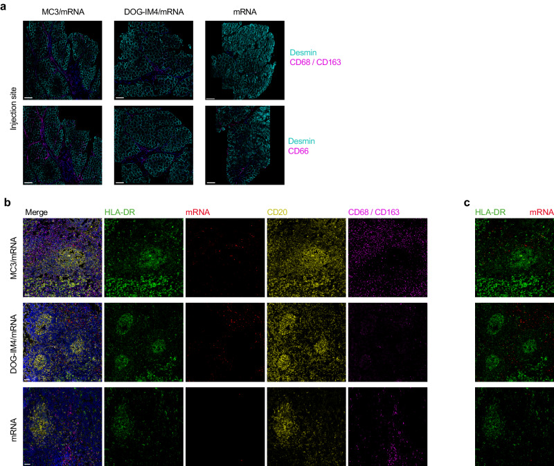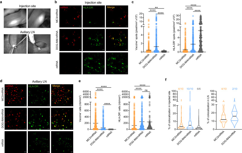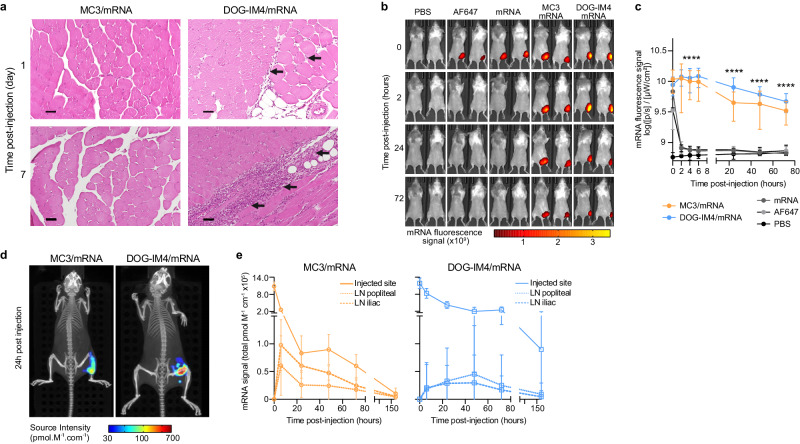 The characterization of vaccine distribution to relevant tissues after in vivo administration is critical to understanding their mechanisms of action. Vaccines based on mRNA lipid nanoparticles (LNPs) are now being widely considered against infectious diseases and cancer. Here, we used in vivo imaging approaches to compare the trafficking of two LNP formulations encapsulating mRNA following intramuscular administration: DLin-MC3-DMA (MC3) and the recently developed DOG-IM4. The mRNA formulated in DOG-IM4 LNPs persisted at the injection site, whereas mRNA formulated in MC3 LNPs rapidly migrated to the draining lymph nodes. Furthermore, MC3 LNPs induced the fastest increase in blood neutrophil counts after injection and greater inflammation, as shown by IL-1RA, IL-15, CCL-1, and IL-6 concentrations in nonhuman primate sera. These observations highlight the influence of the nature of the LNP on mRNA vaccine distribution and early immune responses.