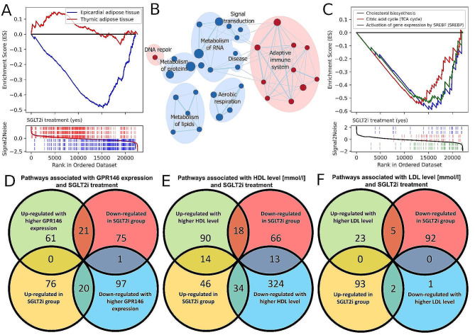Results: We included 46 participants [37 male, 23 with type 2 diabetes, median age 68.50 (Q1-Q3: 63.00-72.00) years, BMI 28.39 (26.06-31.49) kg/m2]. GPR146 expression in adipose tissues significantly correlated with BMI, c-peptide, total cholesterol, and LDL concentrations. Selected metabolic pathways were significantly and positively enriched in GPR146-dependent manner. GPR146-coexpressed genes contained key regulators of lipid metabolism involved in such pathways as fatty acid metabolism, tricarboxilic acid cycle and peroxisomal metabolism. Those genes correlated positively with serum concentrations of LDL, HDL, and total cholesterol. SGLT2i treatment was associated with inversion of GPR146-related signature in EAT, suggesting potential impact on cholesin-GPR146 network.