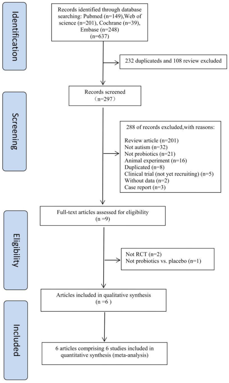 Results: In total, 6 RCTs from 6 studies with 302 children were included in the systemic review. Total 6-GSI (MD=-0.59, 95%CI [-1.02,-0.17], P < 0.05) decreased significantly after oral administration of probiotics. Whereas, there was no statistical difference in ABC, CBCL, SRS, DQ and CGI-I between probiotics and placebo groups in ASD children.