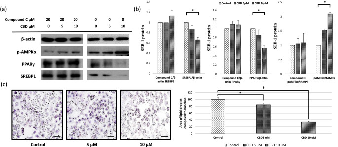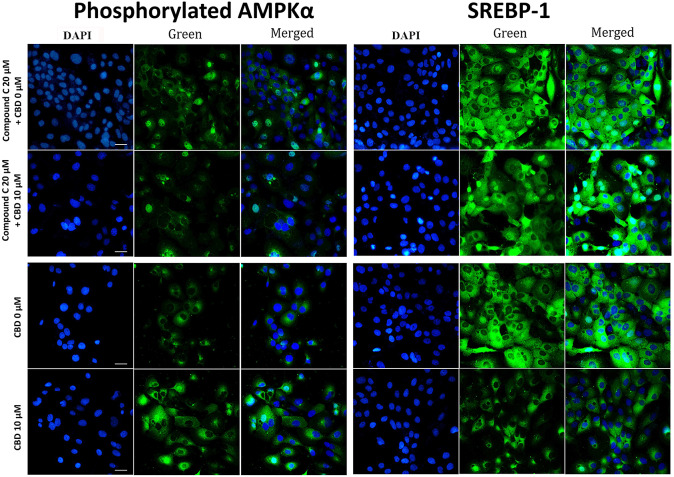 Cannabidiol (CBD), which is derived from hemp, is gaining recognition because of its anti-inflammatory and lipid-modulating properties that could be utilized to treat acne. We conducted experiments to quantitatively assess the effects of CBD on acne-related cellular pathways. SEB-1 sebocytes and HaCaT keratinocytes were exposed to various CBD concentrations. CBD exhibited a concentration-dependent impact on cell viability and notably reduced SEB-1 viability; furthermore, it induced apoptosis and a significant increase in the apoptotic area at higher concentrations. Additionally, CBD remarkably reduced pro-inflammatory cytokines, including CXCL8, IL-1α, and IL-1β. Additionally, it inhibited lipid synthesis by modulating the AMPK-SREBP-1 pathway and effectively reduced hyperkeratinization-related protein keratin 16. Simultaneously, CBD stimulated the synthesis of elastin, collagen 1, and collagen 3. These findings emphasize the potential of CBD for the management of acne because of its anti-inflammatory, apoptotic, and lipid-inhibitory effects. Notably, the modulation of the Akt/AMPK-SREBP-1 pathway revealed a novel and promising mechanism that could address the pathogenesis of acne.