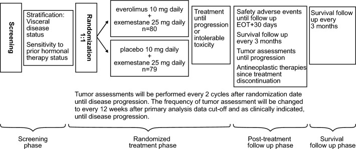 Methods: BOLERO-5 is a randomized, double-blind, multicenter, placebo controlled, phase II trial comparing EVE (10 mg/day) or placebo (PBO) in combination with EXE (25 mg/day). The primary endpoint was progression-free survival (PFS) per investigator assessment. Secondary endpoints included PFS per blinded independent review committee (BIRC), overall survival (OS), overall response rate (ORR), clinical benefit rate (CBR), pharmacokinetics, and safety.