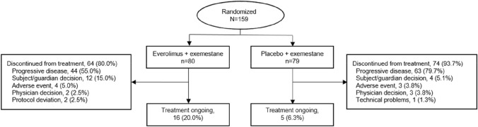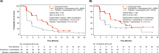 Results: A total of 159 patients were randomized to EVE + EXE (n = 80) or PBO + EXE (n = 79). By investigator assessment, treatment with EVE + EXE prolonged median PFS by 5.4 months (HR 0.52; 90% CI 0.38, 0.71), from 2.0 months (PBO + EXE; 90% CI 1.9, 3.6) to 7.4 months (EVE + EXE; 90% CI 5.5, 9.0). Similar results were observed following assessment by BIRC, with median PFS prolonged by 4.3 months. Treatment with EVE + EXE was also associated with improvements in ORR and CBR. No new safety signals were identified in BOLERO-5, with the incidence of adverse events in Chinese patients consistent with the safety profile of both drugs.