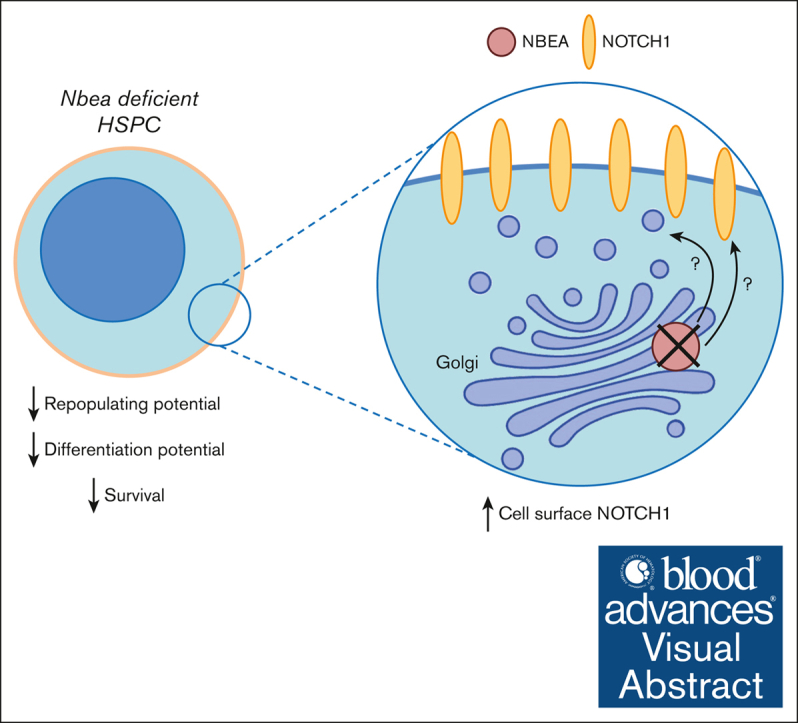 Hematopoietic stem cells (HSCs) can generate all blood cells. This ability is exploited in HSC transplantation (HSCT) to treat hematologic disease. A clear understanding of the molecular mechanisms that regulate HSCT is necessary to continue improving transplant protocols. We identified the Beige and Chediak-Higashi domain-containing protein (BDCP), Neurobeachin (NBEA), as a putative regulator of HSCT. Here, we demonstrated that NBEA and related BDCPs, including LPS Responsive Beige-Like Anchor Protein (LRBA), Neurobeachin Like 1 (NBEAL1) and Lysosomal Trafficking Regulator (LYST), are required during HSCT to efficiently reconstitute the hematopoietic system of lethally irradiated mice. Nbea knockdown in mouse HSCs induced apoptosis and a differentiation block after transplantation. Nbea deficiency in hematopoietic progenitor cells perturbed the expression of genes implicated in vesicle trafficking and led to changes in NOTCH receptor localization. This resulted in perturbation of the NOTCH transcriptional program, which is required for efficient HSC engraftment. In summary, our findings reveal a novel role for NBEA in the control of NOTCH receptor turnover in hematopoietic cells and supports a model in which BDCP-regulated vesicle trafficking is required for efficient HSCT.