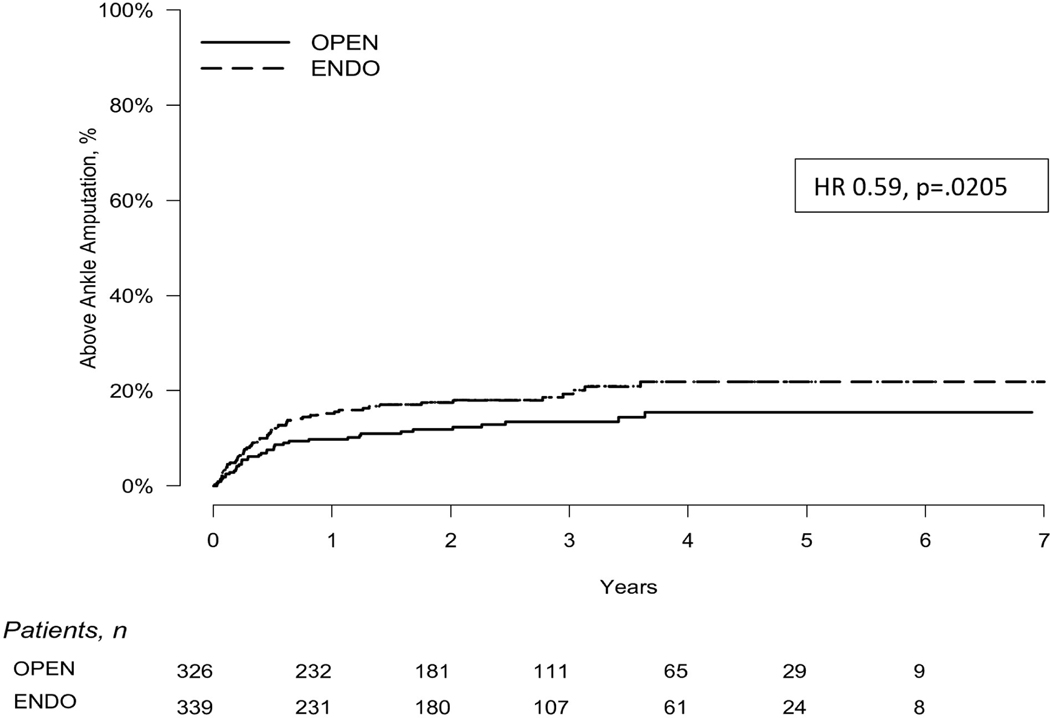 Results: The analyzed subgroup included a total of 665 patients with 326 in the open tibial bypass group and 339 in the tibial endovascular intervention group. The primary outcome of MALE or all-cause death at 3 years was significantly lower in the surgical group at 48.5% compared with 56.7% in the endovascular group (P = .0018). Mortality was similar between groups (35.5% open vs 35.8% endovascular; P = .94), whereas MALE events were lower in the surgical group (23.3% vs 35.0%; P<.0001). This difference included a lower rate of major reinterventions in the surgical group (10.9%) compared with the endovascular group (20.2%; P = .0006). Freedom from above ankle amputation or all-cause death was similar between treatment arms at 43.6% in the surgical group compared with 45.3% the endovascular group (P = .30); however, there were fewer above ankle amputations in the surgical group (13.5%) compared with the endovascular group (19.3%; P = .0205). Perioperative (30-day) death rates were similar between treatment groups (2.5% open vs 2.4% endovascular; P = .93), as was 30-day major adverse cardiovascular events (5.3% open vs 2.7% endovascular; P = .12).