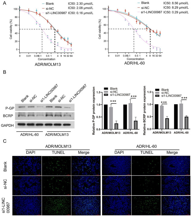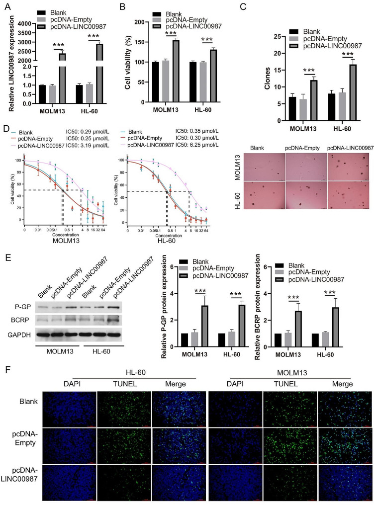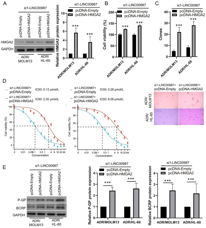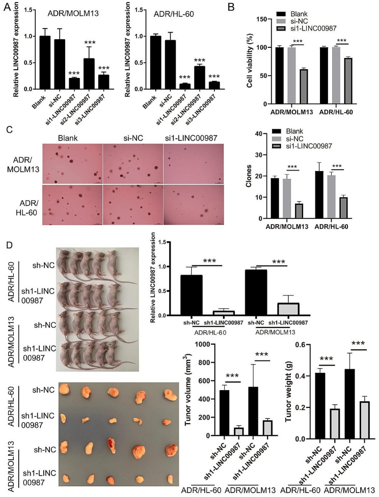 Methods: In this study, ADR-resistant cells were constructed. LINC00987, miRNAs, and HMGA2 mRNA expression were measured by qRT-PCR. P-GP, BCRP, and HMGA2 protein were measured by Western blot. The proliferation was analyzed by MTS and calculated IC50. Soft agar colony formation assay and TUNEL staining were used to analyze cell colony formation and apoptosis. Xenograft tumor experiment was used to analyze the xenograft tumor growth of ADR-resistant AML.