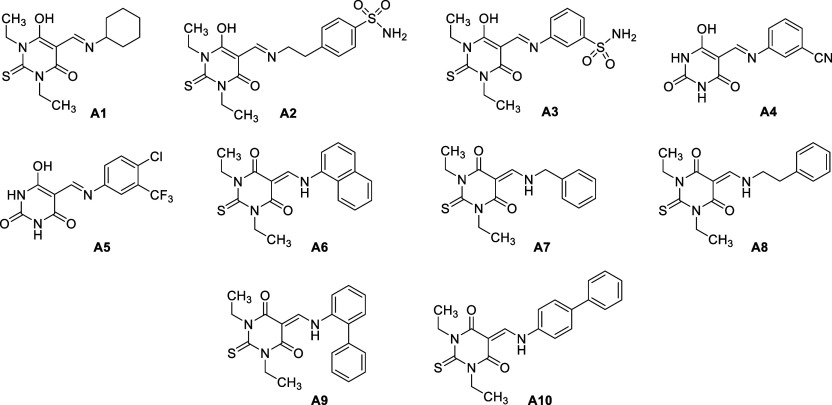 New 2-thioxopyrimidinone derivatives (A1-A10) were synthesized in 87-96% yields via a simple three-component condensation reaction. These compounds were screened extensively through in vitro assays for antioxidant and antibacterial investigations. The DPPH assays resulted in the excellent potency of A6-A10 as antioxidants with IC50 values of 0.83 ± 0.125, 0.90 ± 0.77, 0.36 ± 0.063, 1.4 ± 0.07, and 1.18 ± 0.06 mg/mL, which were much better than 1.79 ± 0.045 mg/mL for the reference ascorbic acid. These compounds exhibited better antibacterial potency against Klebsiella with IC50 values of 2 ± 7, 1.32 ± 8.9, 1.19 ± 11, 1.1 ± 12, and 1.16 ± 11 mg/mL for A6-A10. High-throughput screenings (HTS) of these motifs were carried out including investigation of drug-like behaviors, physiochemical property evaluation, and structure-related studies involving DFT and metabolic transformation trends. The radical scavenging ability of the synthesized motifs was validated through molecular docking studies through ligand-protein binding against human inducible nitric oxide synthase (HINOS) PDB ID: 4NOS, and the results were promising. Furthermore, the antiviral capability of the compounds was examined by in silico studies using two viral proteins PDB ID: 6Y84 and PDB ID: 6LU7. Binding poses of ligands were discussed, and amino acids in the protein binding pockets were investigated, where the tested compounds showed much better binding affinities than the standard inhibitors, proving to be suitable leads for antiviral drug discovery. The stabilities of the molecular docked complexes in real systems were validated by molecular dynamics simulations.