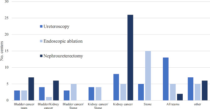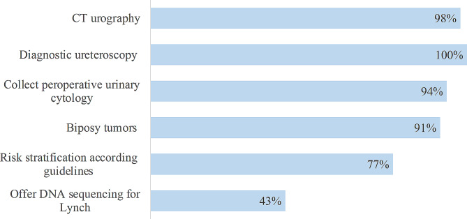 Results: Overall response rate was 47/93 (67%) with a completion rate of 98%. Five out of the 6 examined subjects on diagnostic practice are applied by ≥ 72% of the participating centers. NU as treatment for high-risk UTUC is performed by 37/47 (79%), and 91% include a bladder cuff excision.