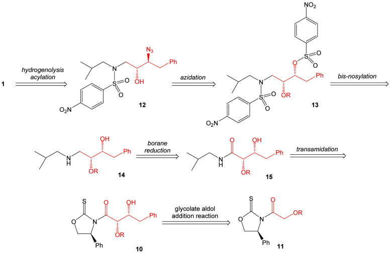 Darunavir is a potent HIV protease inhibitor that has been established as an effective tool in the fight against the progression of HIV/AIDS in the global community. The successful application of this drug has spurred the development of derivatives wherein strategic regions (e.g., P1, P1', P2, and P2') of the darunavir framework have been structurally modified. An alternate route for the synthesis of darunavir and three related P1 and P1' derivatives has been developed. This synthetic pathway involves the use of a Crimmins titanium tetrachloride-mediated oxazolidine-2-thione-guided asymmetric glycolate aldol addition reaction. The resultant aldol adduct introduces the P1 fragment of darunavir via an aldehyde. Transamidation with a selected amine (isobutylamine or 2-ethyl-1-butylamine) to cleave the auxiliary yields an amide wherein the P1' component is introduced. From this stage, the amide is reduced to the corresponding β-amino alcohol and the substrate is then bis-nosylated to introduce the requisite p-nitrobenzenesulfonamide component and activate the secondary alcohol for nucleophilic substitution. Treatment with sodium azide yielded the desired azides, and the deprotection of the p-methoxyphenoxy group is achieved with the use of ceric ammonium nitrate. Finally, hydrogenation to reduce both the aniline and azide functionalities with concurrent acylation yields darunavir and its derivatives.