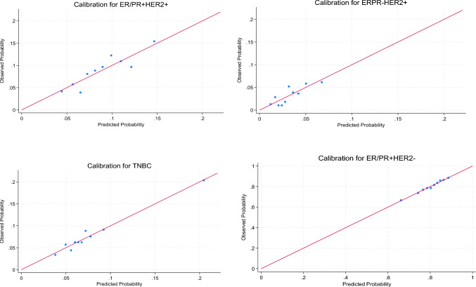 Results: There were 3,073 ER/PR+ HER2 - , 340 ER/PR +HER2 + , 126 ER/PR-ER2+, and 300 triple-negative breast cancers (TNBC). Discrimination differed by subtype; ER/PR-HER2+ (AUC: 0.64, 95% CI 0.59, 0.69) and TNBC (AUC: 0.64, 95% CI 0.61, 0.68) had better discrimination than ER/PR+HER2+ (AUC: 0.61, 95% CI 0.58, 0.64). Compared to other subtypes, patients at high absolute risk of TNBC were younger, mostly Black, had no family history of breast cancer, and higher BMI. Those at high absolute risk of HER2+ cancers were younger and had lower BMI.