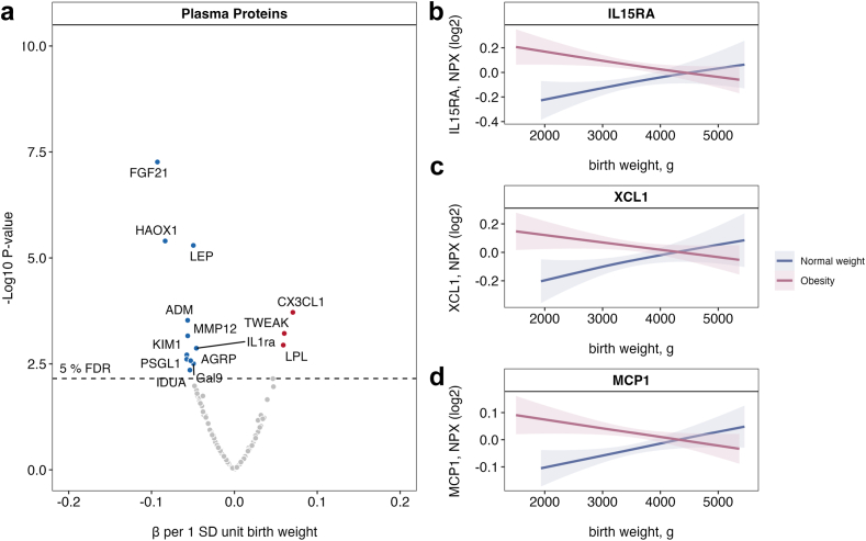 Findings: BW and a PGS for BW associated with cardiometabolic risk and plasma protein levels in childhood and adolescence. Childhood obesity modified the associations between BW and measures of insulin resistance, including HOMA-IR (βadj [95% CI per SD] for obesity: -0.12 [-0.15, -0.08]; normal weight: -0.04 [-0.08, 0.00]; Pinteraction = 0.004), c-peptide (obesity: -0.11 [-0.14, -0.08]; normal weight: -0.02 [-0.06, 0.02]; Pinteraction = 5.05E-04), and SBP SDS (obesity: -0.12 [-0.16, -0.08]; normal weight: -0.06 [-0.11, -0.01]; Pinteraction = 0.0479). Childhood obesity also modified the associations between BW and plasma levels of 14 proteins (e.g., IL15RA, MCP1, and XCL1; Pinteraction < 0.05).