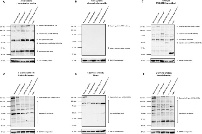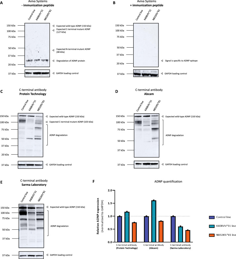 Heterozygous de novo mutations in the Activity-Dependent Neuroprotective Homeobox (ADNP) gene underlie Helsmoortel-Van der Aa syndrome (HVDAS). Most of these mutations are situated in the last exon and we previously demonstrated escape from nonsense-mediated decay by detecting mutant ADNP mRNA in patient blood. In this study, wild-type and ADNP mutants are investigated at the protein level and therefore optimal detection of the protein is required. Detection of ADNP by means of western blotting has been ambiguous with reported antibodies resulting in non-specific bands without unique ADNP signal. Validation of an N-terminal ADNP antibody (Aviva Systems) using a blocking peptide competition assay allowed to differentiate between specific and non-specific signals in different sample materials, resulting in a unique band signal around 150 kDa for ADNP, above its theoretical molecular weight of 124 kDa. Detection with different C-terminal antibodies confirmed the signals at an observed molecular weight of 150 kDa. Our antibody panel was subsequently tested by immunoblotting, comparing parental and homozygous CRISPR/Cas9 endonuclease-mediated Adnp knockout cell lines and showed disappearance of the 150 kDa signal, indicative for intact ADNP. By means of both a GFPSpark and Flag-tag N-terminally fused to a human ADNP expression vector, we detected wild-type ADNP together with mutant forms after introduction of patient mutations in E. coli expression systems by site-directed mutagenesis. Furthermore, we were also able to visualize endogenous ADNP with our C-terminal antibody panel in heterozygous cell lines carrying ADNP patient mutations, while the truncated ADNP mutants could only be detected with epitope-tag-specific antibodies, suggesting that addition of an epitope-tag possibly helps stabilizing the protein. However, western blotting of patient-derived hiPSCs, immortalized lymphoblastoid cell lines and post-mortem patient brain material failed to detect a native mutant ADNP protein. In addition, an N-terminal immunoprecipitation-competent ADNP antibody enriched truncating mutants in overexpression lysates, whereas implementation of the same method failed to enrich a possible native mutant protein in immortalized patient-derived lymphoblastoid cell lines. This study aims to shape awareness for critical assessment of mutant ADNP protein analysis in Helsmoortel-Van der Aa syndrome.