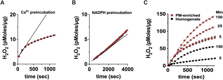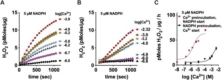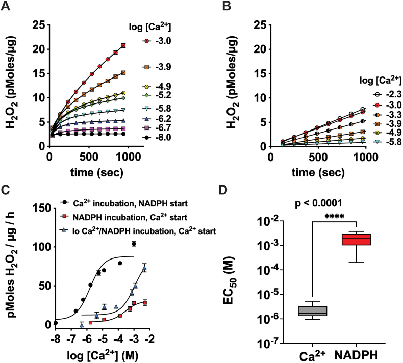 Hydrogen peroxide is a key element in redox signaling and in setting cellular redox tone. DUOX1 and DUOX2, that directly synthesize hydrogen peroxide, are the most abundant NADPH oxidase transcripts in most epithelia. DUOX1 and DUOX2 hydrogen peroxide synthesis is regulated by intracellular calcium transients and thus cells can respond to signals and initiate responses by increasing cellular hydrogen peroxide synthesis. Nevertheless, many details of their enzymatic regulation are still unexplored. DUOX1 and DUOXA1 were expressed in HEK293T cells and activity was studied in homogenates and membrane fractions. When DUOX1 homogenates or membranes were pre-incubated in NADPH and started with addition of Ca2+, to mimic intracellular activation, progress curves were distinctly different from those pre-incubated in Ca2+ and started with NADPH. The Ca2+ EC50 for DUOX1's initial rate when pre-incubated in Ca2+, was three orders of magnitude lower (EC50 ∼ 10-6 M) than with preincubation in NADPH (EC50 ∼ 10-3 M). In addition, activity was several fold lower with Ca2+ start. Identical results were obtained using homogenates and membrane fractions. The data suggested that DUOX1 Ca2+ binding in expected physiological signaling conditions only slowly leads to maximal hydrogen peroxide synthesis and that full hydrogen peroxide synthesis activity in vivo only can occur when encountering extremely high concentration Ca2+ signals. Thus, a complex interplay of intracellular NADPH and Ca2+ concentrations regulate DUOX1 over a wide extent and may limit DUOX1 activity to a restricted range and spatial distribution.