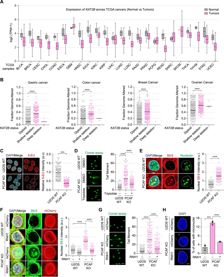 R-loops are harmful DNA-RNA hybrid structures that cause genome instability, disrupting normal cell functions. This study explored the role of the protein PCAF in resolving R-loops to maintain genome stability. The researchers found that depleting PCAF leads to increased R-loop formation, especially during transcription, compromising the genome. Mechanistically, PCAF facilitates histone acetylation, recruiting proteins like MRE11, EXO1, FANCM and BLM to R-loop sites. These proteins collaborate to resolve R-loop structures. The findings suggest that PCAF, histone acetylation, and these repair proteins work together to untangle R-loops and preserve genome integrity. Understanding this process provides insights into R-loop dynamics and PCAF's role in genome maintenance, potentially leading to therapeutic strategies for diseases associated with genome instability, such as cancer.