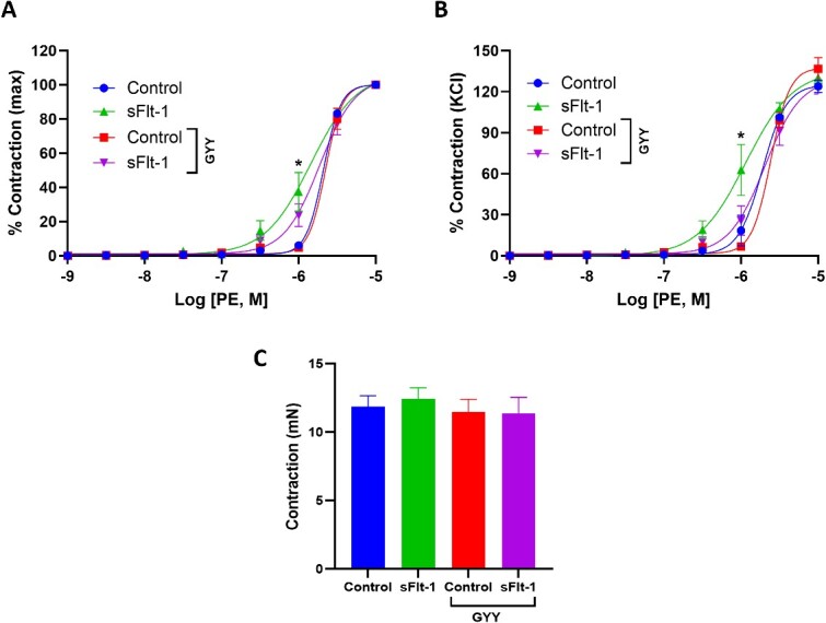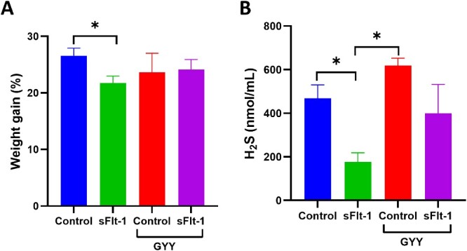 Gestational hypertension, often associated with elevated soluble Fms-related receptor tyrosine kinase 1 (sFlt-1), poses significant risks to both maternal and fetal health. Hydrogen sulfide (H2S), a gasotransmitter, has demonstrated blood pressure-lowering effects in hypertensive animals and humans. However, its role in pregnancy-induced hypertension remains unclear. This study investigated the impact of GYY4137, a slow-release H2S donor, on sFlt-1-induced hypertension in pregnant rats . Pregnant rats were administered sFlt-1 (6 μg/kg/day, intravenously) or vehicle from gestation day (GD) 12-20. A subset of these groups received GYY4137 ( 50 mg/kg/day, intraperitoneal) from GD 16-20. Serum H2S levels, mean arterial blood pressure, uterine artery blood flow, and vascular reactivity were assessed. Elevated sFlt-1 reduced both maternal weight gain and serum H2S levels. GYY4137 treatment restored both weight gain and H2S levels in sFlt-1 dams. sFlt-1 increased mean arterial pressure and decreased uterine artery blood flow in pregnant rats. However, treatment with GYY4137 normalized blood pressure and restored uterine blood flow in sFlt-1 dams. sFlt-1 dams exhibited heightened vasoconstriction to phenylephrine and GYY4137 significantly mitigated the exaggerated vascular contraction. Notably, sFlt-1 impaired endothelium-dependent relaxation, while GYY4137 attenuated this impairment by upregulating eNOS protein levels and enhancing vasorelaxation in uterine arteries. GYY4137 mitigated sFlt-1-induced fetal growth restriction. In conclusion, sFlt-1 mediated hypertension is associated with decreased H2S levels. Replenishing H2S with the donor GYY4137 mitigates hypertension and improves vascular function and fetal growth outcomes. This suggests modulation of H2S could offer a novel therapeutic strategy for managing gestational hypertension and adverse fetal effects.