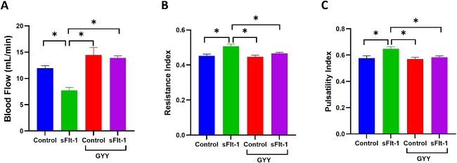 Keywords: GYY4137; endothelium; hydrogen sulfide; hypertension; pregnancy; sFlt-1; uterine artery.