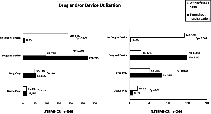 Results: Our study included 1,110 patients with AMI-CS, of which 731 (65.8%) had STEMI-CS and 379 (34.2%) had NSTEMI-CS. Most patients were male (STEMI-CS: 71.6%, NSTEMI-CS: 66.5%) and White (STEMI-CS: 53.8%, NSTEMI-CS: 64.1%). In-hospital mortality was 41% and was similar among patients with STEMI-CS and NSTEMI-CS (43% vs 39%, P = 0.23). Patients with out-of-hospital cardiac arrest had higher in-hospital mortality in patients with NSTEMI-CS (63% vs 36%, P = 0.006) as compared to patients with STEMI-CS (52% vs 41%, P = 0.16). Similar results were observed for in-hospital cardiac arrest in patients with STEMI-CS (63% vs 33%, P < 0.001) and NSTEMI-CS (60% vs 32%, P < 0.001). Only 27% of patients with STEMI-CS and 12% of NSTEMI-CS received both a drug and temporary mechanical circulatory support device during the first 24 hours, which increased to 78% and 61%, respectively, throughout the course of the hospitalization (P < 0.001 for both).