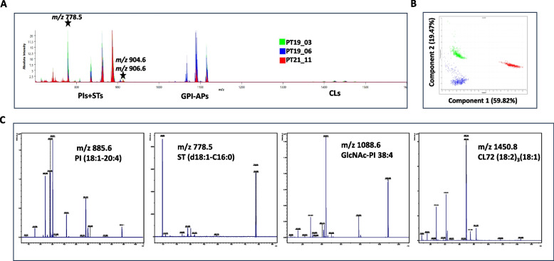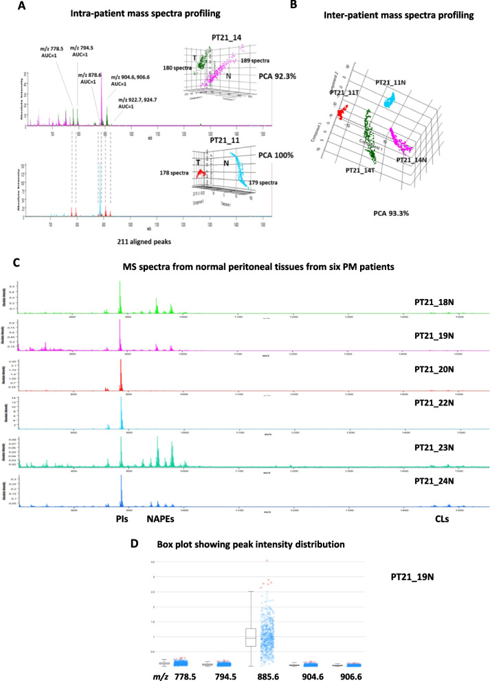 Even with systemic chemotherapy, cytoreductive surgery (CRS), and hyperthermic intraperitoneal chemotherapy (HIPEC), peritoneal metastases (PM) remain a common site of disease progression for colorectal cancer (CRC) and are frequently associated with a poor prognosis. The mass spectrometry (MS) method known as Matrix-Assisted Laser Desorption/Ionization - Time of Flight (MALDI-TOF) is frequently used in medicine to identify structural compounds and biomarkers. It has been demonstrated that lipids are crucial in mediating the aggressive growth of tumors. In order to investigate the lipid profiles, particularly with regard to histological distribution, we used MALDI-TOF MS (MALDI-MS) and MALDI-TOF imaging MS (MALDI-IMS) on patient-derived tumor organoids (PDOs) and PM clinical samples. According to the MALDI-IMS research shown here, the predominant lipid signature of PDOs in PM tissues, glycosphingolipid (GSL) sulfates or sulfatides, or STs, is unique to the areas containing tumor cells and absent from the surrounding stromal compartments. Bioactive lipids are derived from arachidonic acid (AA), and AA-containing phosphatidylinositol (PI), or PI (18:0-20:4), is shown to be highly expressed in the stromal components. On the other hand, the tumor components contained a higher abundance of PI species with shorter and more saturated acyl chains (C34 and C36 carbons). The cellular subversion of PI and ST species may alter in ways that promote the growth, aggressiveness, and metastasis of tumor cells. Together, these findings suggest that the GSL/ST metabolic programming of PM may contain novel therapeutic targets to impede or halt PM progression.
