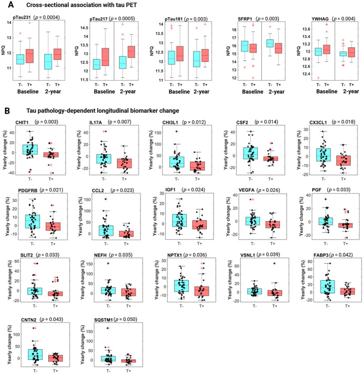 Results: NULISA concurrently measured 116 plasma biomarkers with good technical performance, and good correlation with Simoa measures. Cross-sectionally, p-tau217 was the top hit to identify Aβ pathology, with age, sex, and APOE genotype-adjusted AUC of 0.930 (95%CI: 0.878-0.983). Fourteen markers were significantly decreased in Aβ-PET+ participants, including TIMP3, which regulates brain Aβ production, the neurotrophic factor BDNF, the energy metabolism marker MDH1, and several cytokines. Longitudinally, FGF2, IL4, and IL9 exhibited Aβ PET-dependent yearly increases in Aβ-PET+ participants. Markers with tau PET-dependent longitudinal changes included the microglial activation marker CHIT1, the reactive astrogliosis marker CHI3L1, the synaptic protein NPTX1, and the cerebrovascular markers PGF, PDGFRB, and VEFGA; all previously linked to AD but only reliably measured in cerebrospinal fluid. SQSTM1, the autophagosome cargo protein, exhibited a significant association with neurodegeneration status after adjusting age, sex, and APOE ε4 genotype.