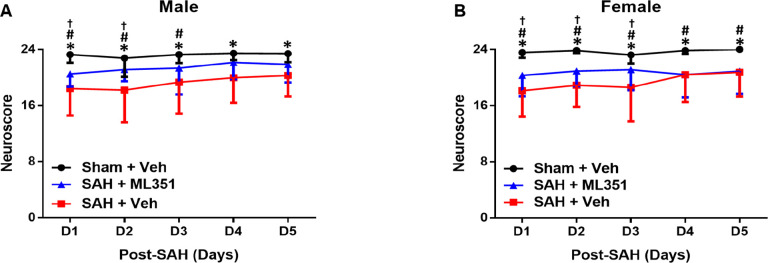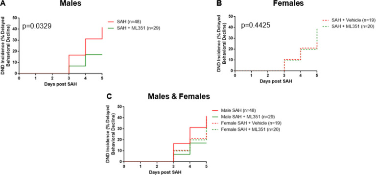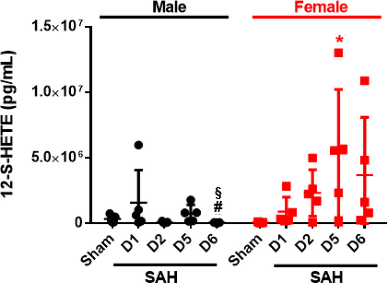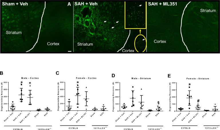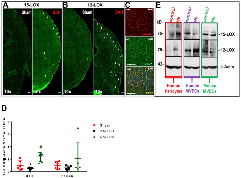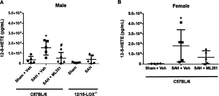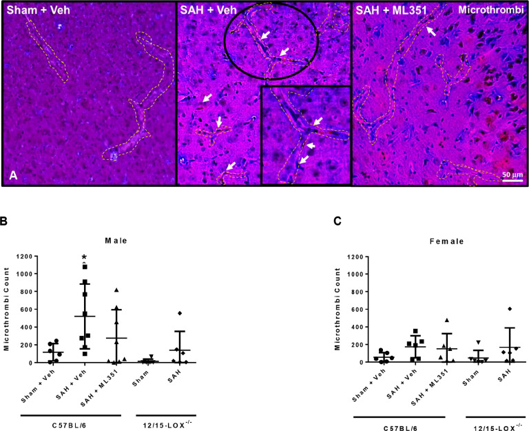 Methods: SAH was induced in C57BL/6 and 12/15-LOX-/- mice of both sexes by endovascular perforation. Expression of 12/15-LOX was assessed in brain tissue slices and in vitro. C57BL/6 mice were administered either ML351 (12/15-LOX inhibitor) or vehicle. Mice were evaluated for daily neuroscore and euthanized on day five to assess cerebral 12/15-LOX expression, vessel constrictions, platelet activation, microthrombi, neurodegeneration, infarction, cortical perfusion, and for development of delayed deficits. Finally, the effect of 12/15-LOX inhibition on platelet activation was assessed in SAH patient samples using a platelet spreading assay.