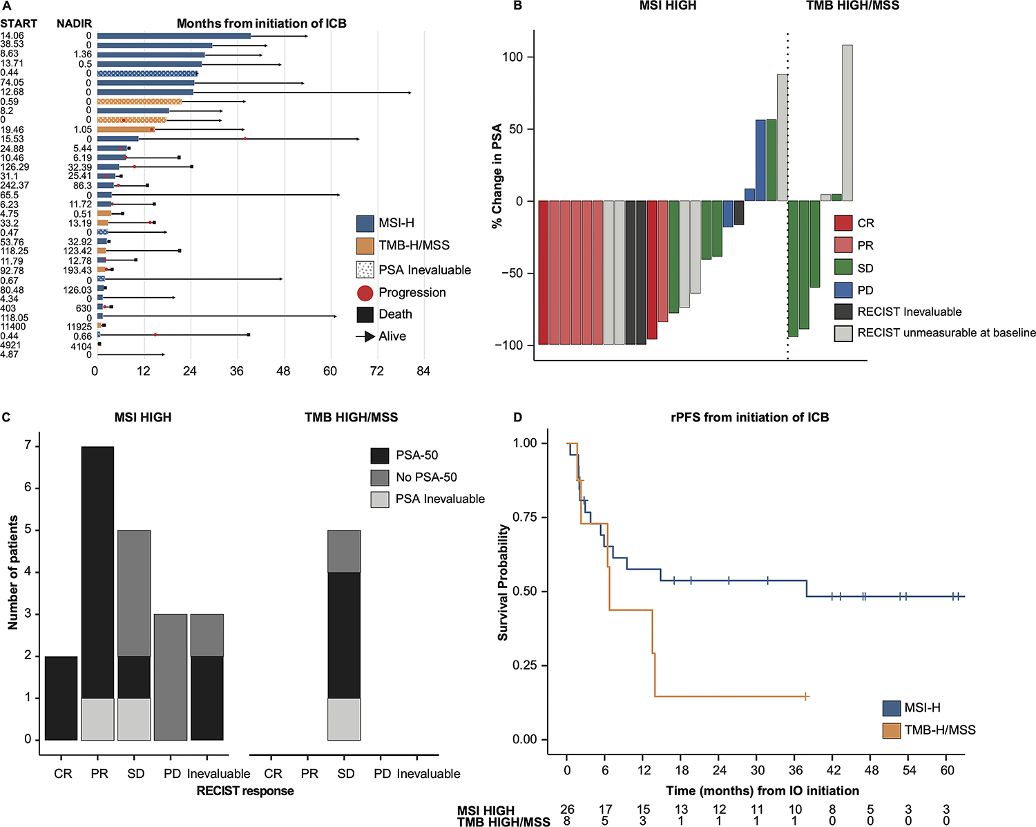 Results: Sixty-three (2.8%) men had MSI-H/dMMR, and 33 (1.5%) had TMB-H/MSS prostate cancers. Patients with MSI-H/dMMR and TMB-H/MSS tumors more commonly presented with grade group 5 and metastatic disease at diagnosis. MSI-H/dMMR tumors had higher TMB, indel, and neoantigen burden compared with TMB-H/MSS. Twenty-seven patients with MSI-H/dMMR and 8 patients with TMB-H/MSS tumors received ICB, none of whom harbored polymerase epsilon (polE) catalytic subunit mutations. About 45% of patients with MSI-H/dMMR had a RECIST response, and 65% had a PSA50 response. No patient with TMB-H/MSS had a RECIST response, and 50% had a PSA50 response. rPFS tended to be longer in patients with MSI-H/dMMR than in patients with TMB-H/MSS who received immunotherapy. Pronounced differences in genomics, TMB, or MSIsensor score were not detected between MSI-H/dMMR responders and nonresponders.