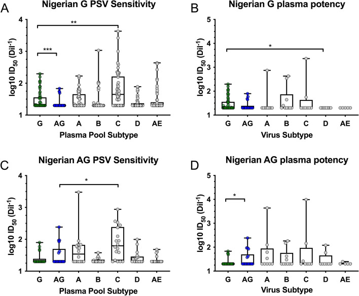 The magnitude of the HIV-1 epidemic in Nigeria is second only to the subtype C epidemic in South Africa, yet the subtypes prevalent in Nigeria require further characterization. A panel of 50 subtype G and 18 CRF02_AG Nigerian HIV-1 pseudoviruses (PSV) was developed and envelope coreceptor usage, neutralization sensitivity and cross-clade reactivity were characterized. These PSV were neutralized by some antibodies targeting major neutralizing determinants, but potentially important differences were observed in specific sensitivities (eg. to sCD4, MPER and V2/V3 monoclonal antibodies), as well as in properties such as variable loop lengths, number of potential N-linked glycans and charge, demonstrating distinct antigenic characteristics of CRF02_AG and subtype G. There was preferential neutralization of the matched CRF/subtype when PSV from subtype G or CRF02_AG were tested using pooled plasma. These novel Nigerian PSV will be useful to study HIV-1 CRF- or subtype-specific humoral immune responses for subtype G and CRF02_AG.