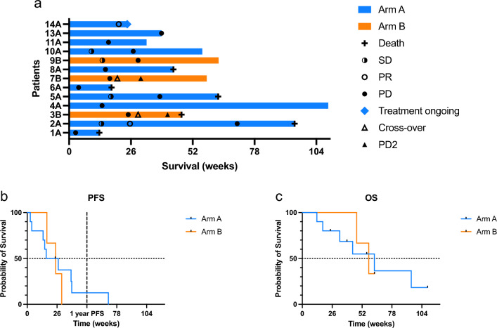 Results: Thirteen patients (10 in arm A, eight non-small cell lung cancer, and five melanoma) were enrolled. Two patients crossed over. One-year PFS rate was 10% in arm A and 0% in arm B. Two patients in arm A obtained a partial response, and one patient obtained a stable disease as best response. In arm B, one patient obtained a SD. Median PFS and OS were 21.8 weeks (arm A) versus 24.9 (arm B), and 62.7 versus 57.9 weeks, respectively. An iatrogenic pneumothorax was the only grade 3 treatment-related adverse event.