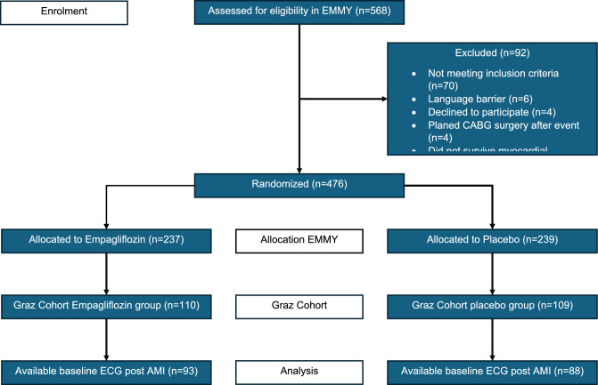 The EMMY trial was a multicentre, investigator-initiated, placebo-controlled, double-blind trial, which enrolled 476 patients immediately following AMI and the first study demonstrating a significant reduction in NT-proBNP-levels as well as significant improvements in cardiac structure and function in patients after acute myocardial infarction treated with empagliflozin vs. placebo. However, hardly any data are available investigating the prognostic role of baseline electrocardiogram metrics in SGLT2-inhibitor-treated patients. This post-hoc analysis investigated the association of baseline ECG metrics collected in one centre of the trial (181 patients) with changes in structural and functional cardiac parameters as well as cardiac biomarkers in response to Empagliflozin treatment. A total of 181 patients (146 men; mean age 58 ± 14 years) were included. Median PQ-interval was 156 (IQR 144-174) milliseconds (ms), QRS width 92 (84-98) ms, QTc interval 453 (428-478) ms, Q-wave duration 45 (40-60) ms, Q-wave amplitude 0.40 (0.30-0.70) millivolt (mV), and heart rate was 71 (64-85) bpm. For functional cardiac parameters (LVEF and E/e') of the entire cohort, a greater decrease of E/e' from baseline to week 26 was observed in shorter QRS width (P = 0.005).Structural cardiac endpoints were only found to have a significant positive correlation between LVEDD and Q wave duration (P = 0.037). Higher heart rate was significantly correlated with better response in LVEF (P = 0.001), E/e' (P = 0.021), and NT-proBNP (P = 0.005). Empagliflozin-treatment showed no interaction with the results. Baseline ECG characteristics post AMI are neither predictive for beneficial NTproBNP effects of Empagliflozin post AMI, nor for functional or structural changes within 26 weeks post AMI.