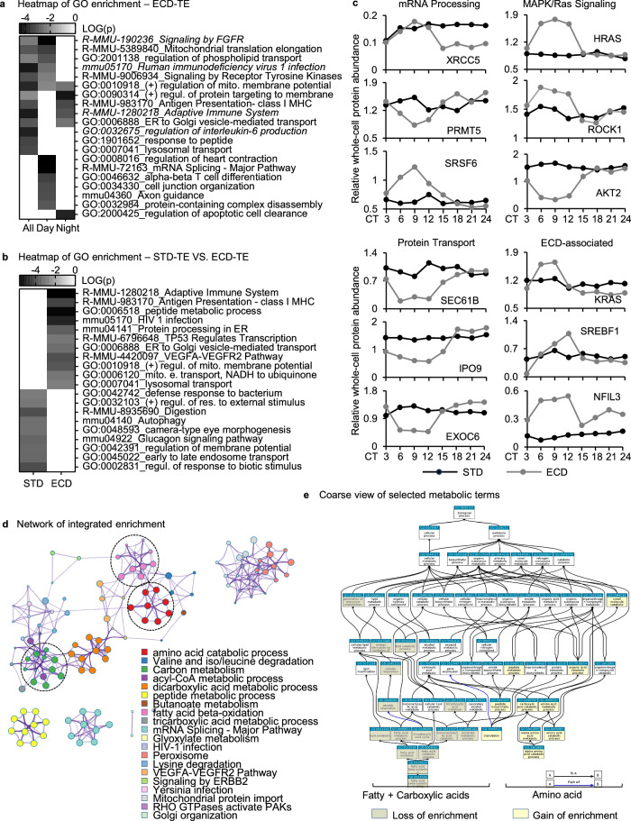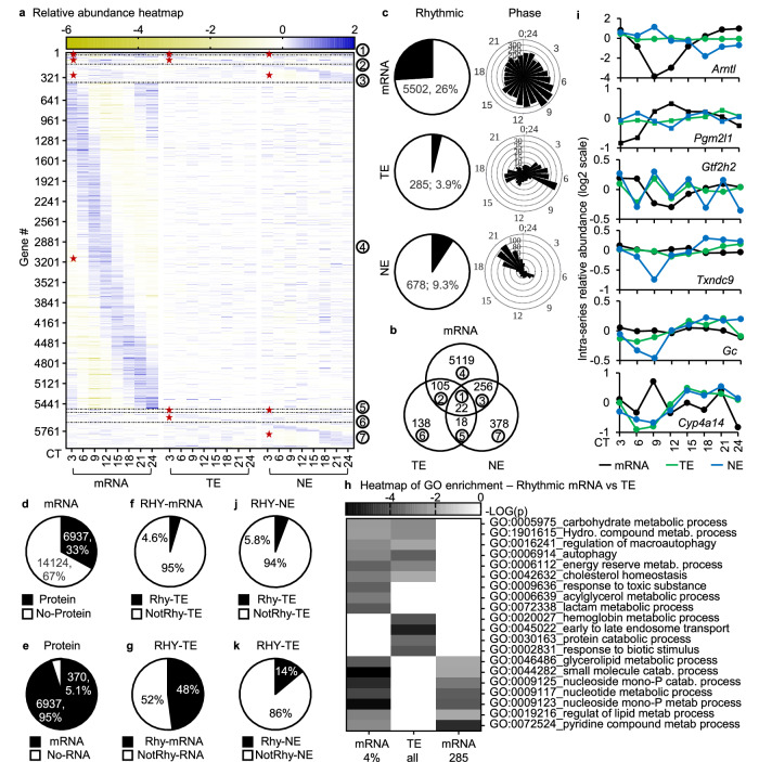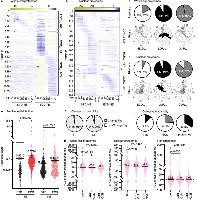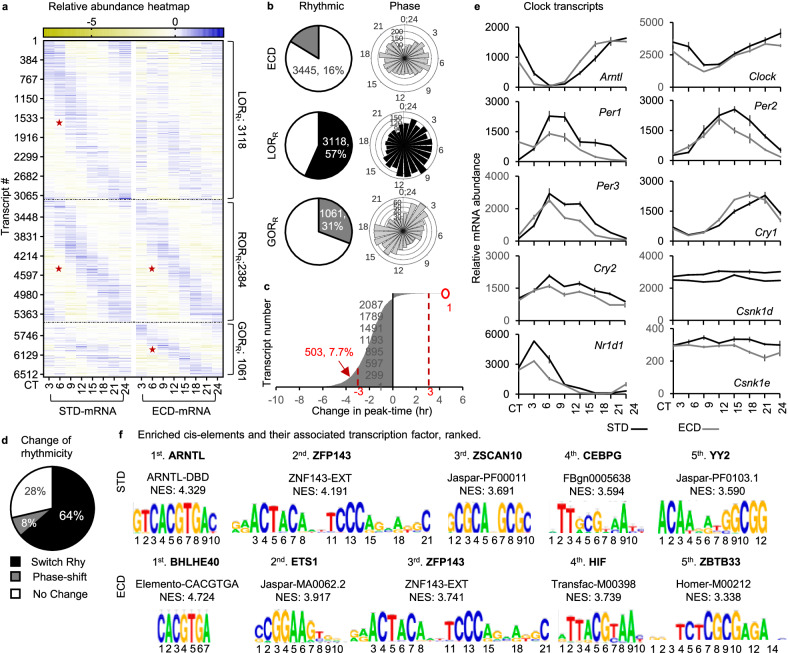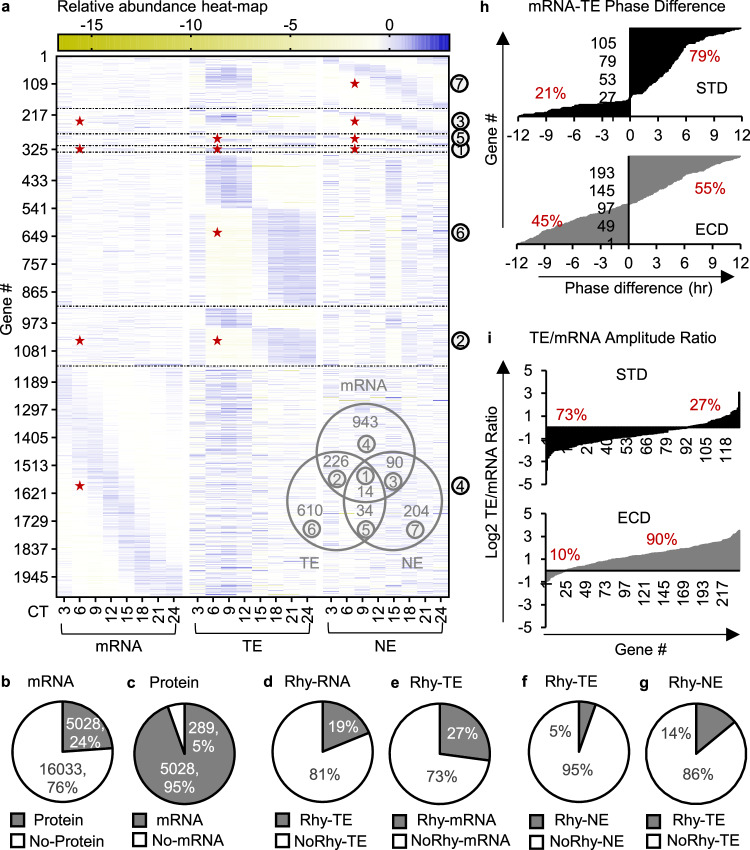 Circadian gene expression is fundamental to the establishment and functions of the circadian clock, a cell-autonomous and evolutionary-conserved timing system. Yet, how it is affected by environmental-circadian disruption (ECD) such as shiftwork and jetlag are ill-defined. Here, we provided a comprehensive and comparative description of male liver circadian gene expression, encompassing transcriptomes, whole-cell proteomes and nuclear proteomes, under normal and after ECD conditions. Under both conditions, post-translation, rather than transcription, is the dominant contributor to circadian functional outputs. After ECD, post-transcriptional and post-translational processes are the major contributors to whole-cell or nuclear circadian proteome, respectively. Furthermore, ECD re-writes the rhythmicity of 64% transcriptome, 98% whole-cell proteome and 95% nuclear proteome. The re-writing, which is associated with changes of circadian regulatory cis-elements, RNA-processing and protein localization, diminishes circadian regulation of fat and carbohydrate metabolism and persists after one week of ECD-recovery.