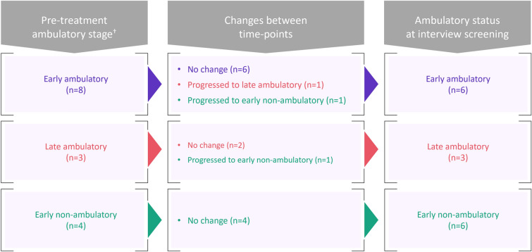 Results: Children with DMD (age 7-15 years [mean 10.9]; steroid treatment at interview, n = 8; time since eteplirsen initiation 3-24 months [mean 14.9]) were described by caregivers as ambulatory (n = 9) and non-ambulatory (n = 6). Caregivers of ambulatory children reported improvements or maintenance of walking ability (n = 7/9), running (n = 6/9), and using stairs (n = 4/9). Continued decline in using stairs was reported by two caregivers. In upper-limb functioning, improvements or maintenances in fine-motor movements were reported by nearly half of all caregivers (n = 7/15), with one caregiver noting a continued decline. Subsequent improvements or maintenances in ADLs were described. Improvements or maintenances in fatigue (n = 9/15), muscle weakness (n = 7/15), and pain (n = 6/15) were reported, although some caregivers described a continued decline (n = 3/15 fatigue, n = 1/15 muscle weakness, n = 2/15 pain). Importantly, most caregivers who reported maintenances in ability perceived this as a positive outcome (n = 6/9).