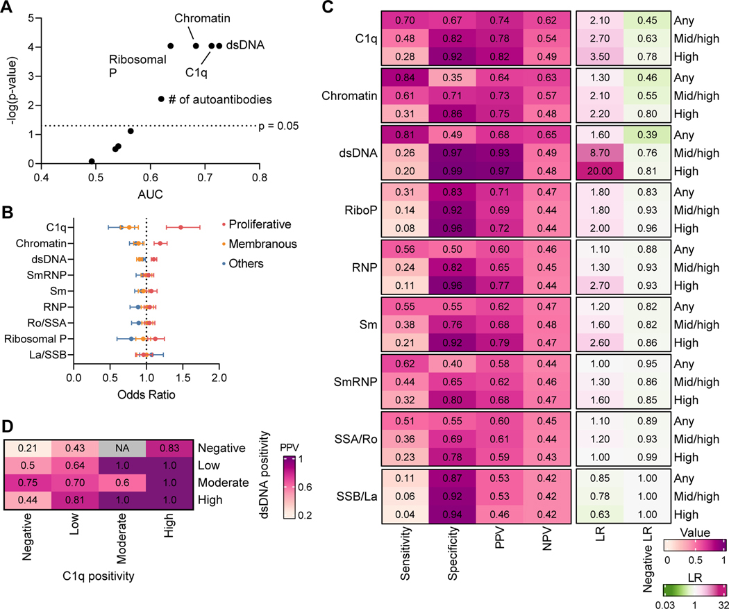 Conclusion: Baseline levels of anti-C1q and anti-dsDNA may serve as noninvasive biomarkers of proliferative LN, and anti-C1q may predict complete response at the time of kidney biopsy. In addition, tracking autoantibodies over time may provide further insights into treatment response and pathogenic mechanisms in patients with proliferative LN.